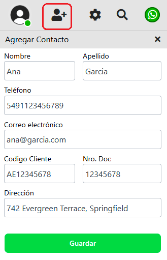 Para agregar un nuevo contacto desde la pantalla chat, un agente debe dirigirse al ícono con forma de persona con un signo de suma, en la parte superior izquierda de la pantalla: